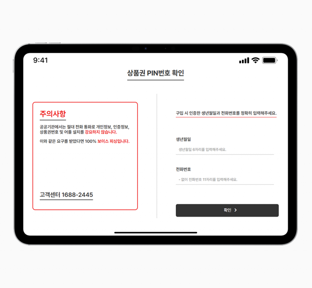 화면 한쪽에 상품권 핀번호가 표시됩니다.