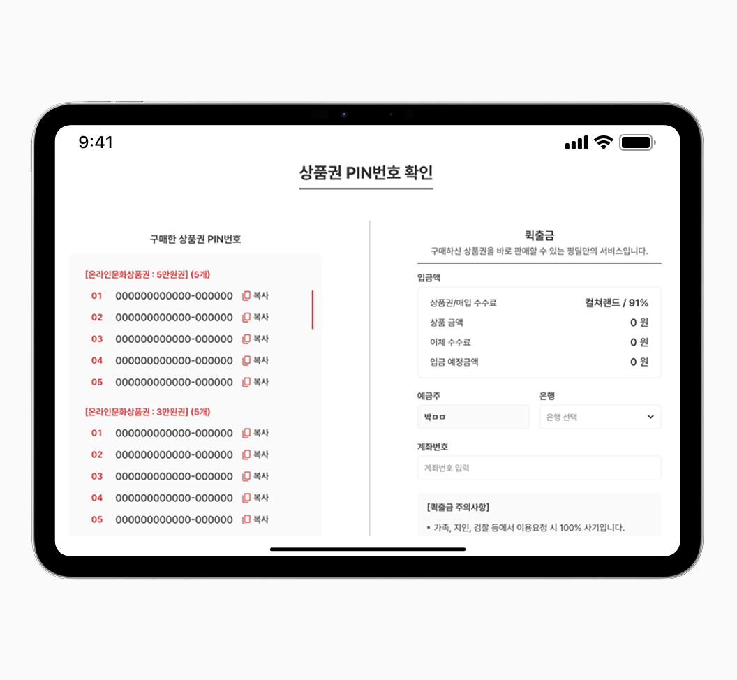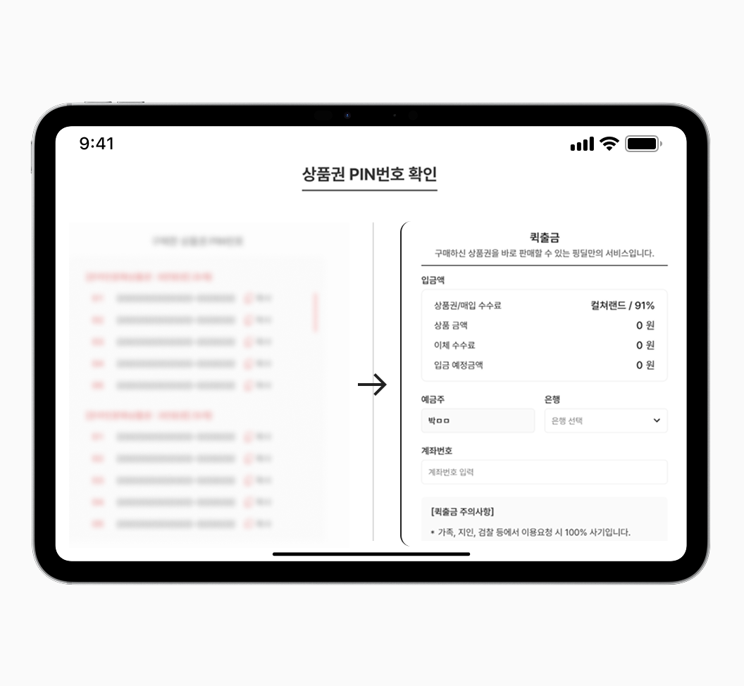 핑딜만의 특별한 서비스인 퀵출금을 통해, 구매한 상품권을 바로 현금으 출금하는 서비스 입니다.